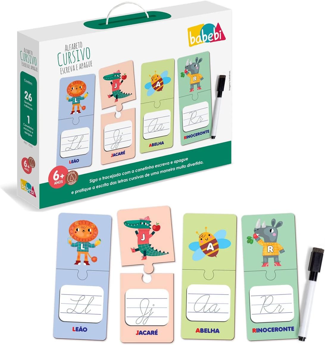 Com o Alfabeto Cursivo Escreve e Apague da Babebi, as crianças podem praticar a escrita das letras cursivas de forma lúdica, utilizando as peças ilustradas e a canetinha especial que permite escrever e apagar quantas vezes quiser.