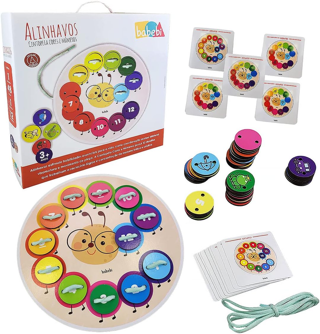 O alinhavo de cores e números é um jogo educativo e divertido para crianças. Ele inclui um tabuleiro ilustrado com uma centopeia, medindo cerca de 25cm de diâmetro, que é usado como base para os desafios propostos pelas 12 fichas inclusas no jogo. Para completar os desafios serão utilizadas 48 peças variadas, incluindo números, quantidades, cores e figuras, o cordão fornecido é usado para amarrar as peças.