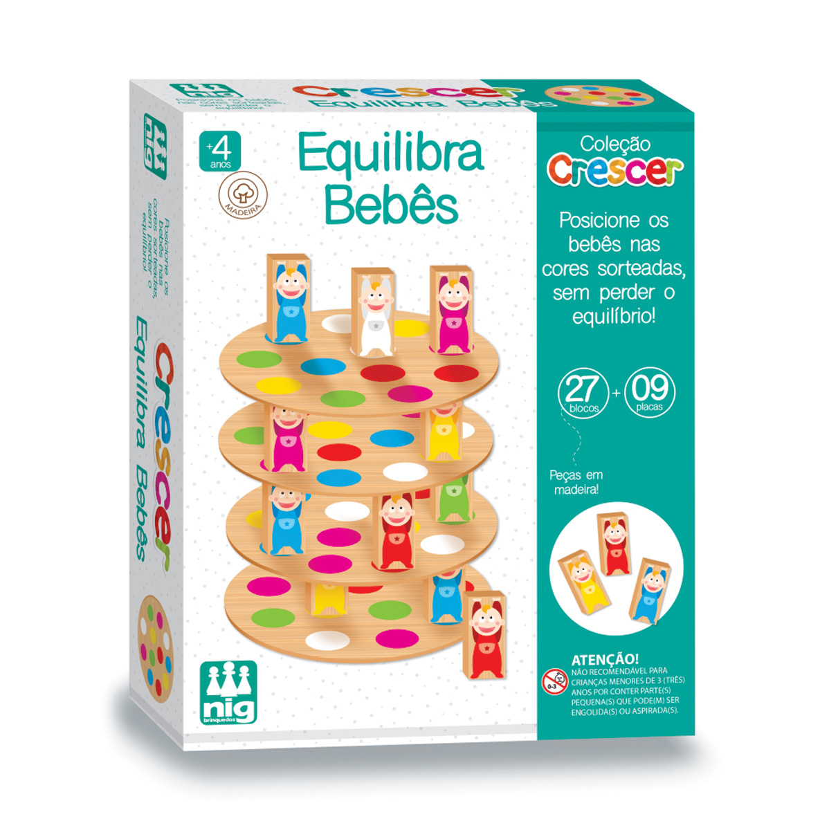 Caixa de atividade para a criança montar a torre mais alta, equilibrando os “bebês” nas cores sorteadas. Não vale deixar cair! Desenvolve as habilidades motoras, a concentração e auxilia o conhecimento das cores. São 09 placas em madeira com várias bolas coloridas, 27 blocos de madeira para a criança adesivar os bebês e um saco plástico para misturar as peças e sortear.