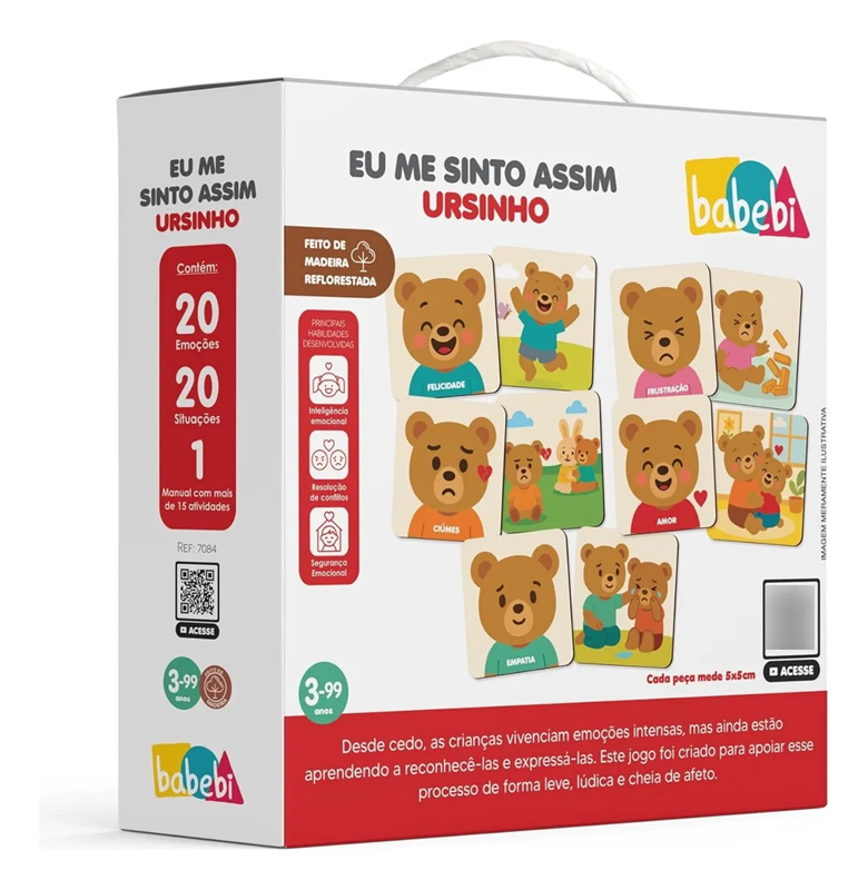 Um jogo afetuoso para ajudar os pequenos a reconhecerem, nomearem e lidarem com as próprias emoções. Com o ursinho como protagonista, as crianças descobrem 20 sentimentos diferentes e associam cada um deles a situações do cotidiano – como tristeza, alegria, vergonha, saudade, medo, amor e tantos outros. Uma forma leve, lúdica e cheia de empatia de construir inteligência emocional desde cedo!