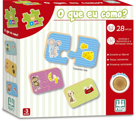 Nesse jogo a criança vai observar cada animal e encaixar a oeça que corresponde à sua comidinha. Os pares são da mesma cor para auxiliar na tarefa. Contém peças grandes de madeira reciclada, coloridas e resistentes.
