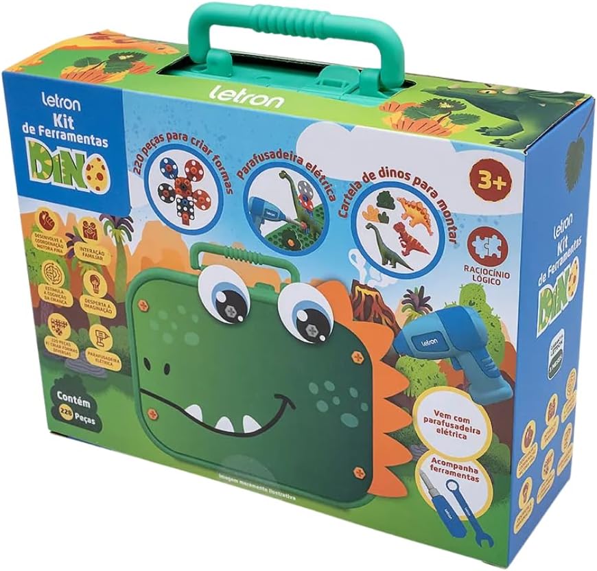 Kit de ferramentas infantil com tema dinossauro, ideal para estimular a criatividade e coordenação motora. Brinquedo educativo para montar e desmontar, com 228 peças e caixa organizadora.