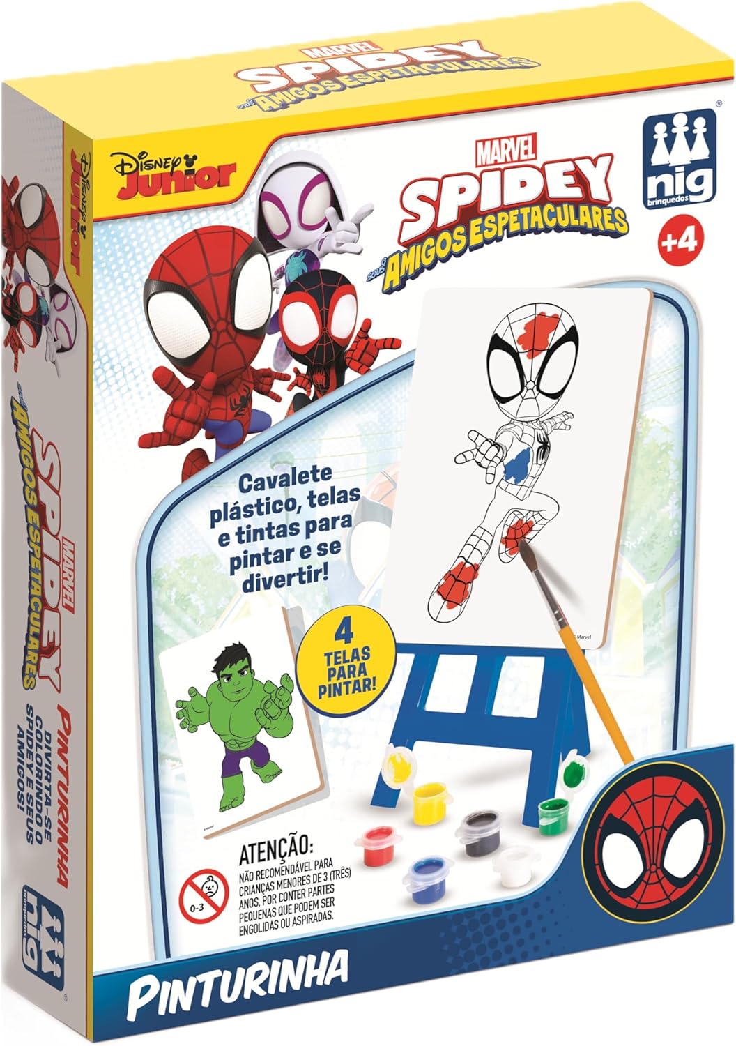 Com 4 telas ilustradas do Homem Aranha, tintas coloridas e cavalete, a criança desenvolve habilidades importantes enquanto se diverte pintando.