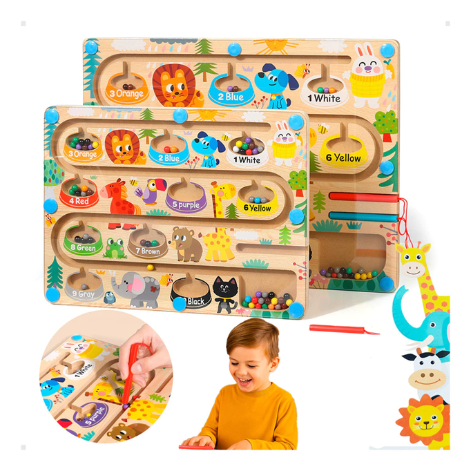 O labirinto de cores e números é colorido e as crianças precisam mover contas de cores diferentes para as cores correspondentes para vencer.