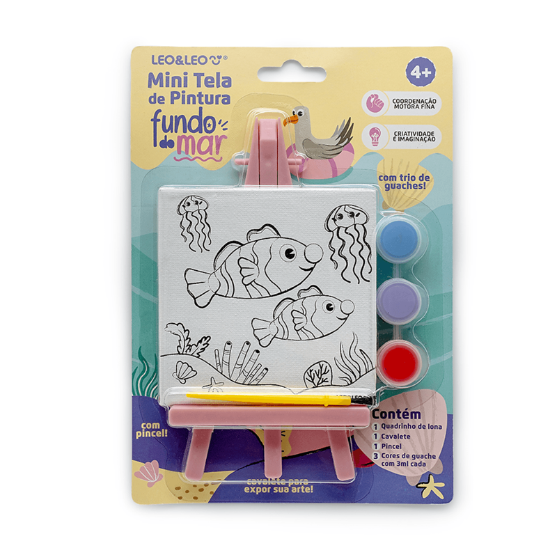 Para os pequenos que gostam de desenhos e querem desenvolver seu lado artista, a Mini Tela de Pintura com Cavalete Fundo do Mar Estampas Sortidas com 1 Cavalete + 1 Quadro + 3 Cores de Guache + 1 Pincel LeoLeo é a pedida certa.Com estampa temática do Fundo do Mar, a tela mini é ideal para atividades artísticas em casa e na escola, já que ela incentiva a expressão artística e o desenvolvimento motor das crianças. A placa oferece estabilidade e qualidade para a pintura.Acompanha cavalete de polipropileno, que além de lindo, é resistente e prático para criar as obras de arte em formato miniatura.Inclui ainda 3 cores de guache, com 3ml cada, garantindo cores vibrantes e durabilidade na pintura.O pincel é perfeito para um acabamento detalhado e suave nas suas pinturas.Com seus quadrinhos colecionáveis, a Mini Tela de Pintura com Cavalete Fundo do Mar oferece 3 estampas diferentes e divertidas, é muito fofa e é recomendada para crianças a partir de 04 anos exporem sua arte! Não recomendável para crianças menores de 3 (três) anos por conter parte(s) pequena(s) que pode(m) ser engolida(s) ou aspirada(s).