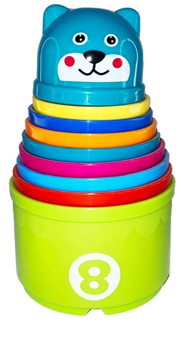 Este kit contém 9 potes no formato de copos, com diferentes tamanhos. Ao empilhá-los, é possível formar uma torre divertida! Os potes são pequenos e simples de manusear, perfeitos para estimular atividades de empilhar e encaixar.